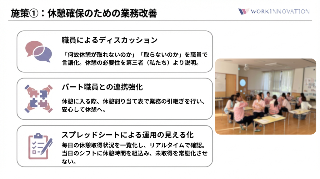 - A園(システム活用):勤怠打刻システムの本格運用を軸に、職員の「時間管理」に対する意識改革を支援。