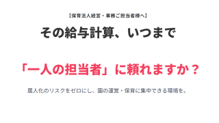 【保育法人経営・事務ご担当者様へ】その給与計算、いつまで「一人の担当者」に頼れますか?属人化のリスクをゼロにし、園の運営・保育に集中できる環境を。プロフェッショナルな外注で、入退社等の手続きと完全連動し、最新IT・クラウドへもフル対応。  ...